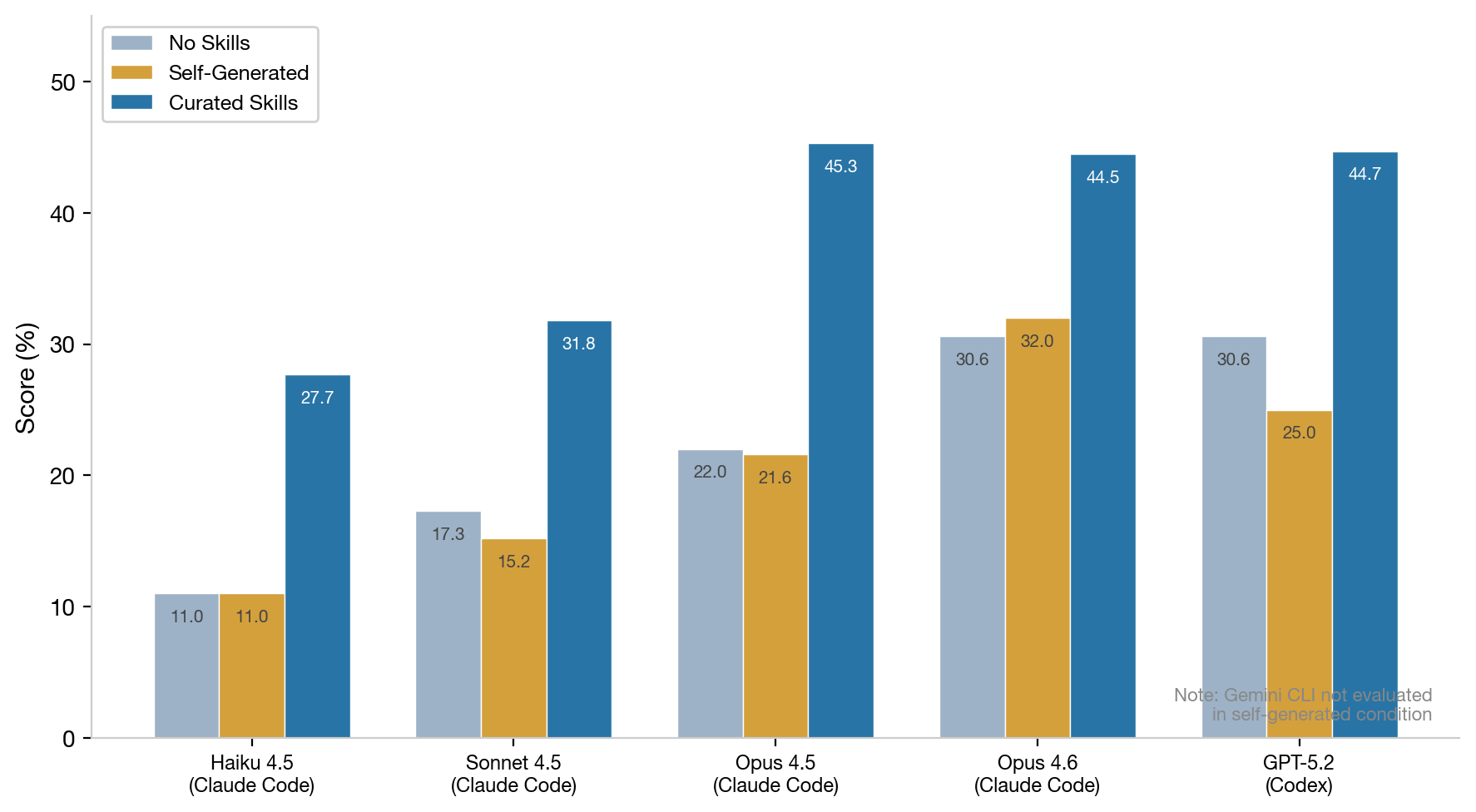 Claude Haiku 4.5 with Skills (27.7%) substantially outperforms Opus 4.5 without Skills (22.0%). A smaller, cheaper model augmented with the right procedural knowledge can match or exceed a larger model operating without guidance. This has significant implications for cost-effective deployment.