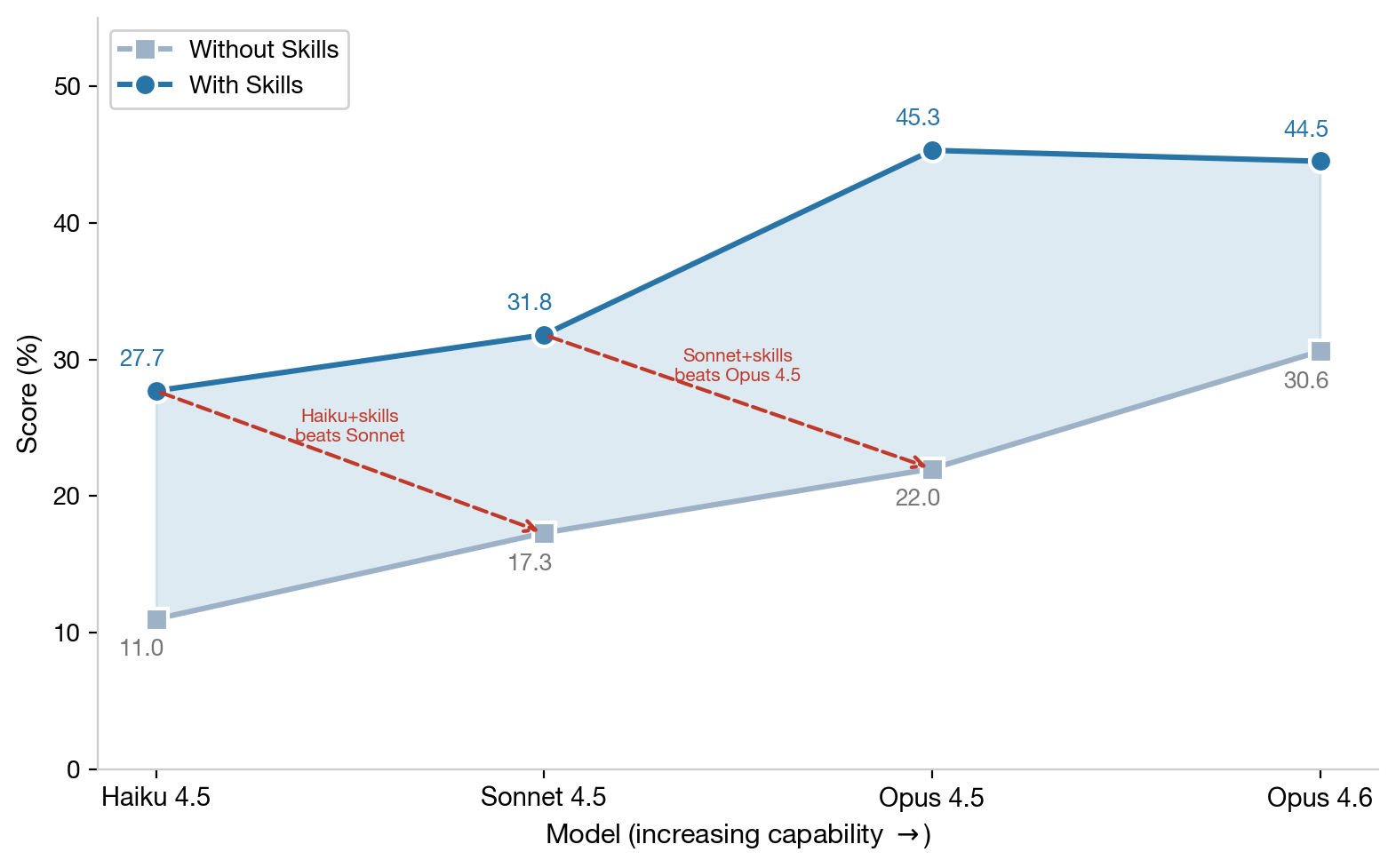 - Paired evaluation is essential. Single-condition benchmarks miss the interaction between Skills and model capabilities. Always evaluate with and without Skills.
